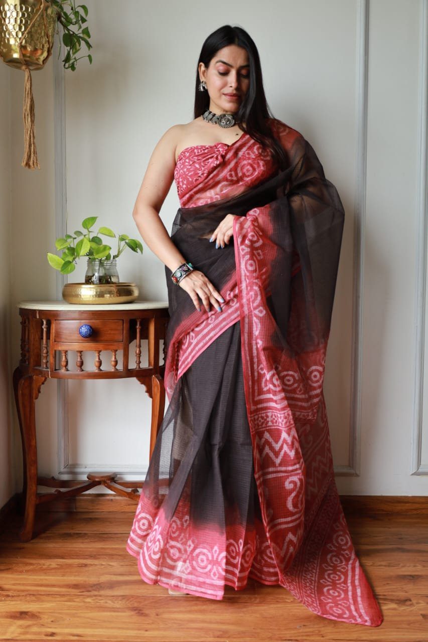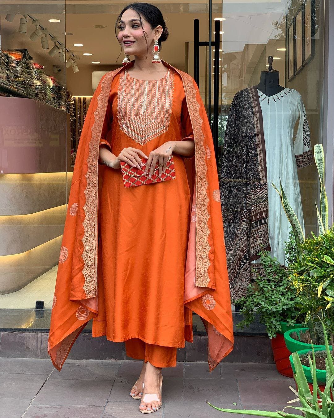 Check out this stunning new arrival! Our Hand block printed chanderi silk dress material is the perfect blend of elegance and comfort. The top and dupatta are made from luxurious chanderi silk, offering a lightweight and breezy feel. The cotton bottom adds to the comfort, making it a perfect outfit for any casual day out or a special occasion. At a fixed price of just 1999 INR, this ensemble won’t break the bank. Get ready to turn heads with this unique piece. Don’t wait too long – it’s a must-have addition to your wardrobe!