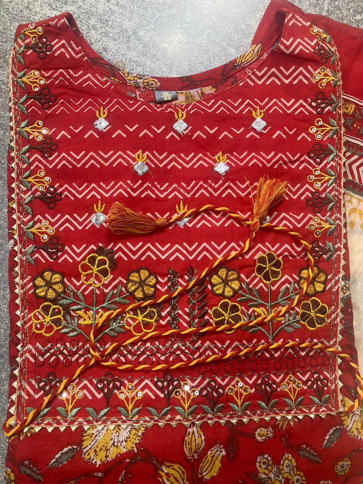 Our Premium Cotton Anarkali Kurti Set is an embodiment of grace and sophistication. This formal wear set includes a beautifully embroidered kurti with doori, highlighted by heavy embroidery and mirror embellishments on the yoke. Accompanied by pure cotton pants and a coordinating full-size dupatta, this ensemble is an ideal choice for cultural or formal events. It offers a perfect blend of style and comfort, available in sizes 38, 40, 42, and 44.